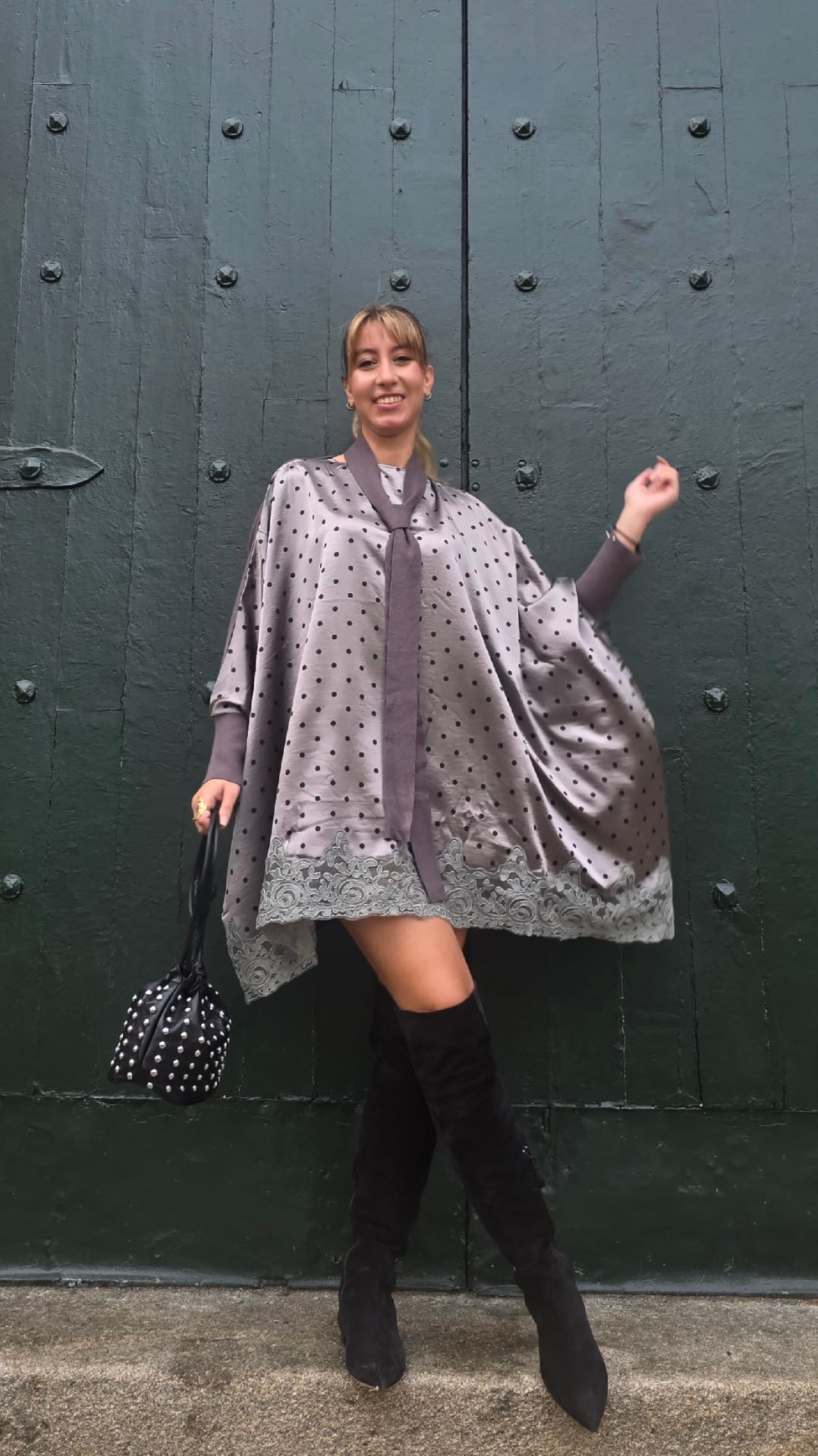 Jersey oversize tipo capa párete delantera en raso con estampado de lunares y parte de atrás de punto . Talla única . Medidas ; sisa a sisa 112 cm largo 76 cm .